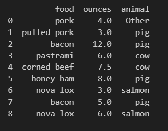 Here, we attempt to map food items to their corresponding animal origins using the meat_to_animal dictionary. However, the dictionary lacks an entry for 'pork', which is present in our original DataFrame.